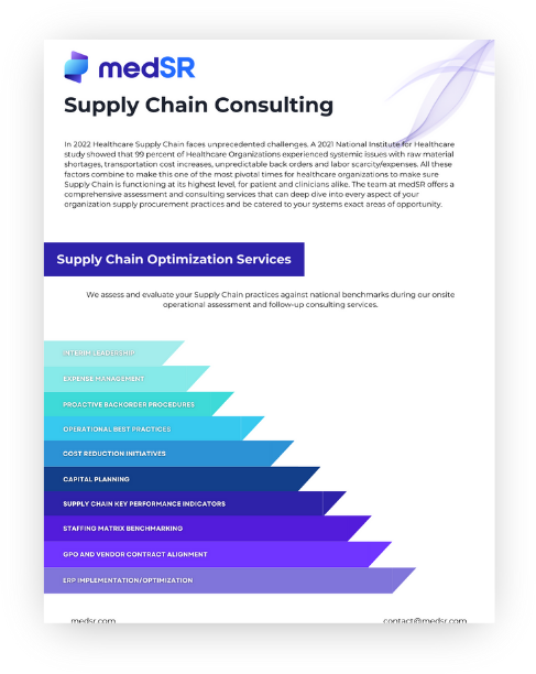 The team at medSR offers a comprehensive assessment and consulting services that can deep dive into every aspect of your organization supply procurement practices and be catered to your systems exact areas of opportunity.